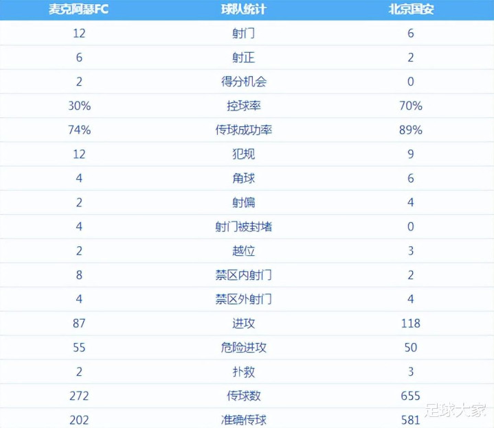 本场比赛北京国安踢出两个极端,好的一方面是场面数据非常漂亮——控球率高达70%,对手仅30%,传球成功率也比对手高出不少,传球次数655是对手的2倍有余。然而漂亮的数据背后却是尴尬的比分:0比3,对手打进3球,国安连像样的威胁射门都没有。